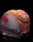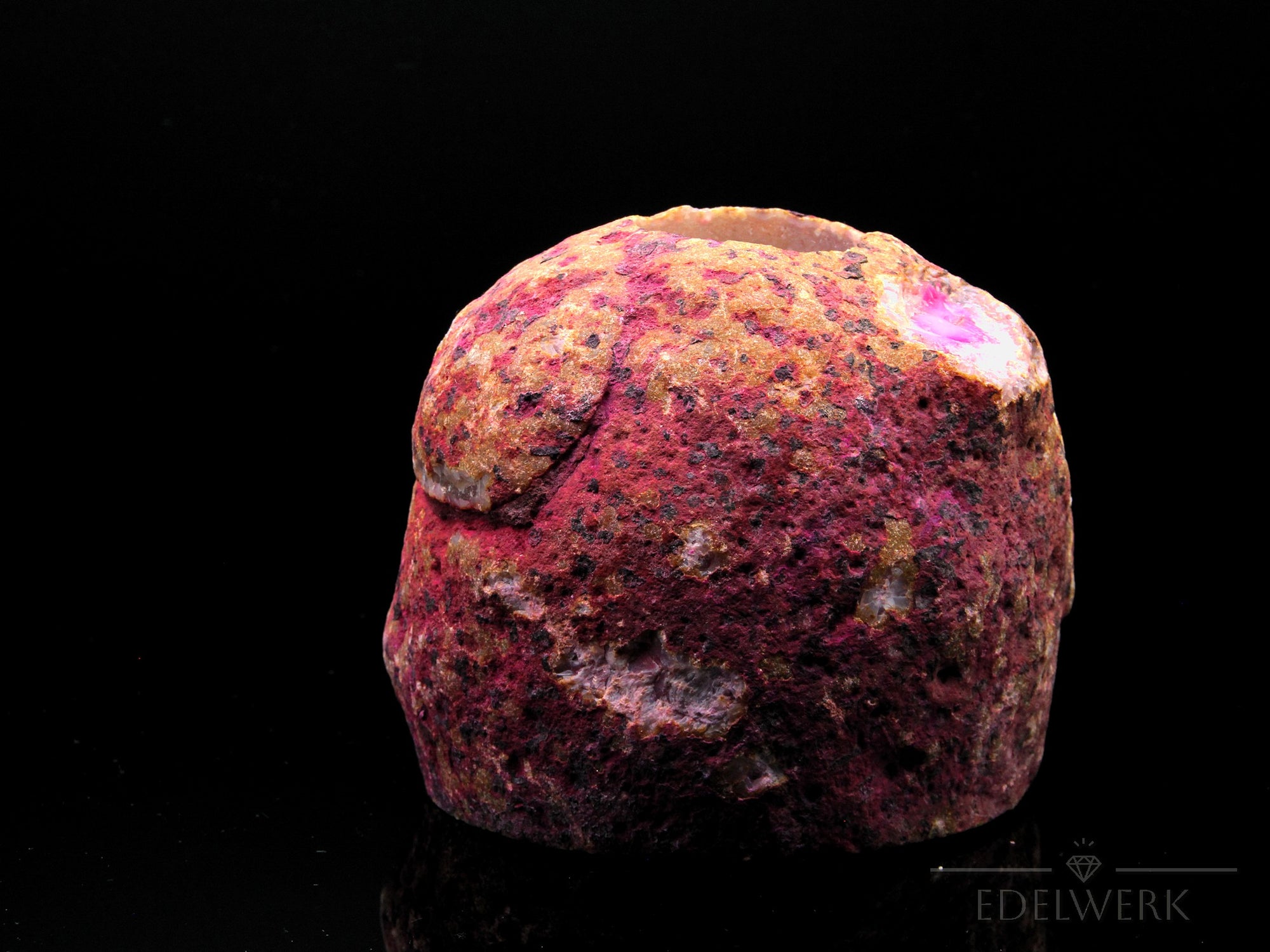 - Charakteristische konzentrische Bänderungen oder Schichtungen, oft in Geoden oder Hohlräumen